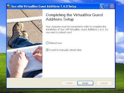 - Guest Additions teelah terinstall silahkan anda pilih reboot now atau i want to reboot later, kemudian klik “Finish”.
